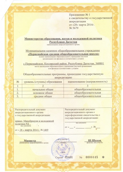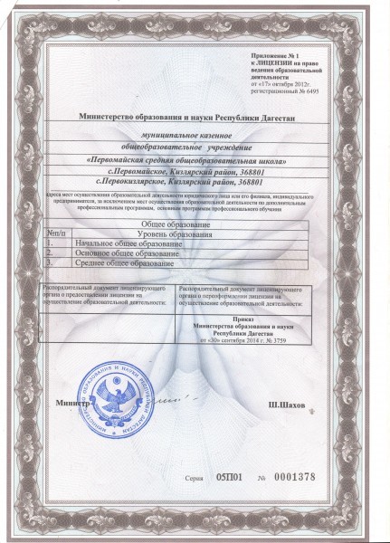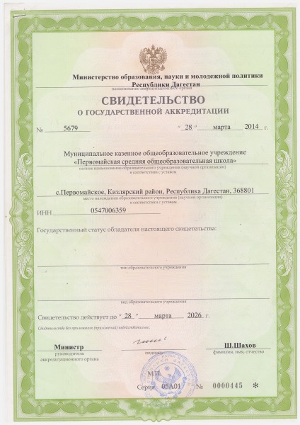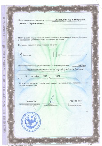 | Адрес местонахождения образовательной организации* | 368801 Кизлярский район, с.Первомайское, ул.Ворошилова |
